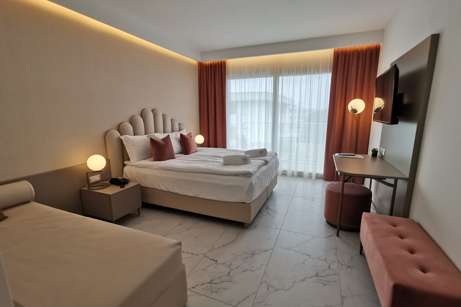 La Suite Deluxe è stata pensata per offrire la massima comodità, grazie agli ampi spazi interni di 52 m2. E’ dotata di 2 letti Queen size e un divano letto doppio, in grado di accogliere fino a 6 persone e mette a disposizione tutti i comfort: 2 bagni, climatizzatore a due zone indipendenti, 2 tv lcd 43, 2 casseforti, 2 frigobar, bollitori, asciugacapelli, accappatoi, pantofole e 2 terrazzini con tavolini e sedie.